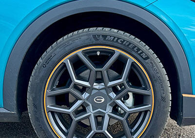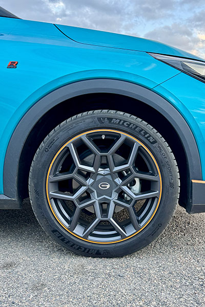 Las llantas de 19” son de 6 radios compuestos, en tono gris oscuro y con una línea de contraste naranja. Calzan cubiertas Michelin Pilot Sport 4 de medida 235/45 R 19 (de serie en este modelo e inusuales para un vehículo de este segmento).