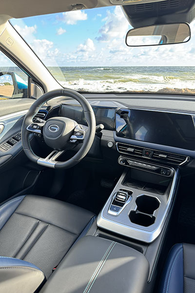 Acorde al exterior, aunque un poco más sobrio. Las sensaciones al entrar son muy buenas, gracias a la calidad de los materiales, sus texturas, costuras de contraste y –lógicamente– su diseño. Butacas confortables (delanteras con ajuste eléctrico) y volante deportivo forrado en eco-cuero, con diseño de tres radios y teclas multi función; palanca de cambios minimalista –que por ser electrónica solo mueve un toque hacia arriba o hacia abajo– acompañada por espacios para carga inalámbrica de dos celulares y una guantera central de generosas dimensiones.