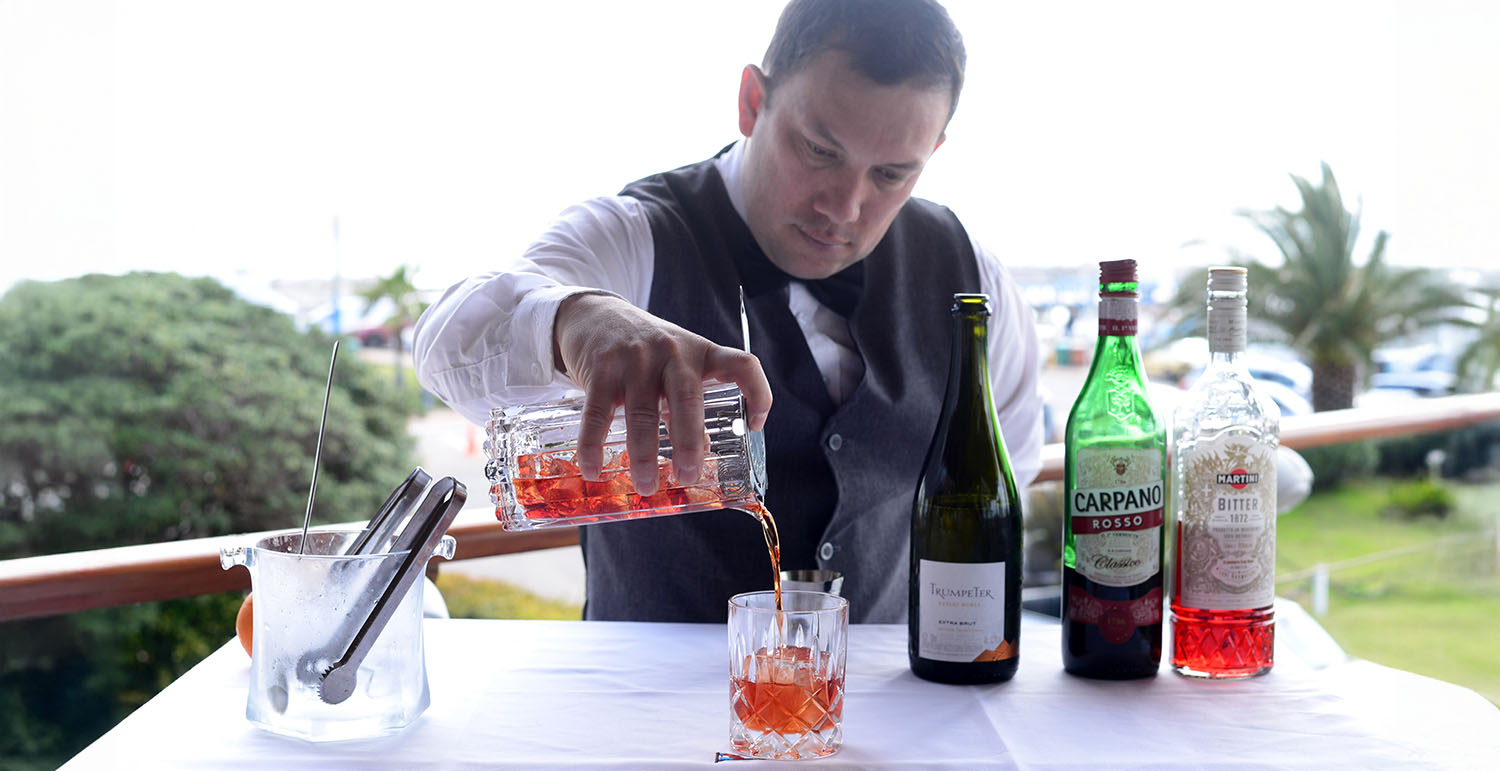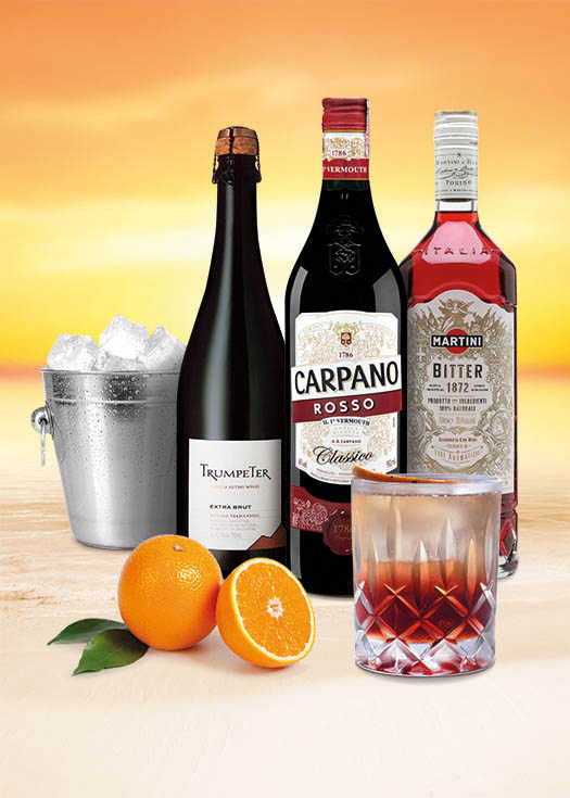 La mezcla de Martini Bitter con vermouth Carpano Rosso y vino espumoso Trumpeter en partes iguales, más el detalle del hielo firme y cristalino con un twist de naranja para perfumar, lo convierten en un aperitivo ideal. ¡Salud!